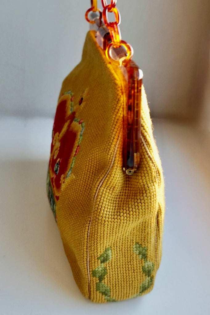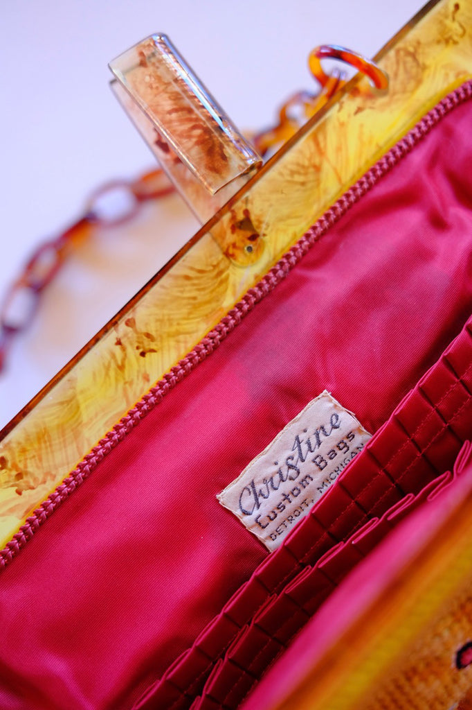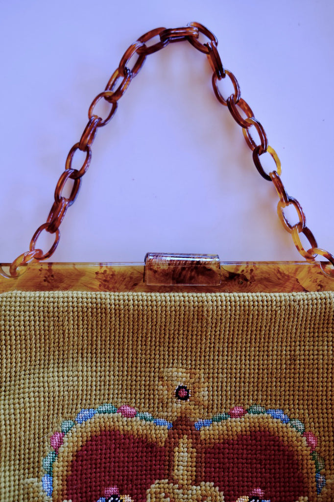 A one-of-a-kind vintage treasure crafted in the traditional Gobelin technique in Detroit, Michigan. This exquisite bag is fully lined in rich red silk and finished with a striking Bakelite frame, complete with a matching clasp and chain.
