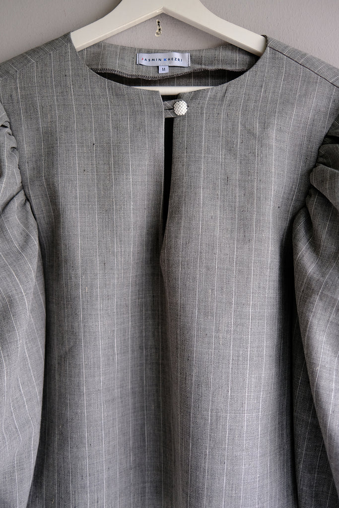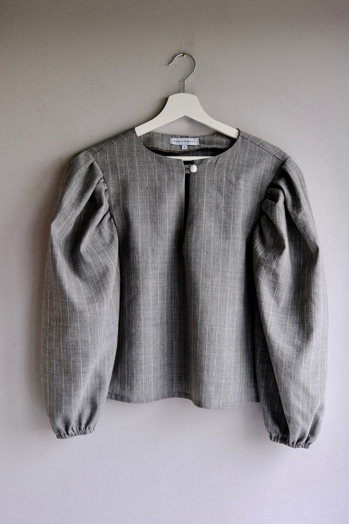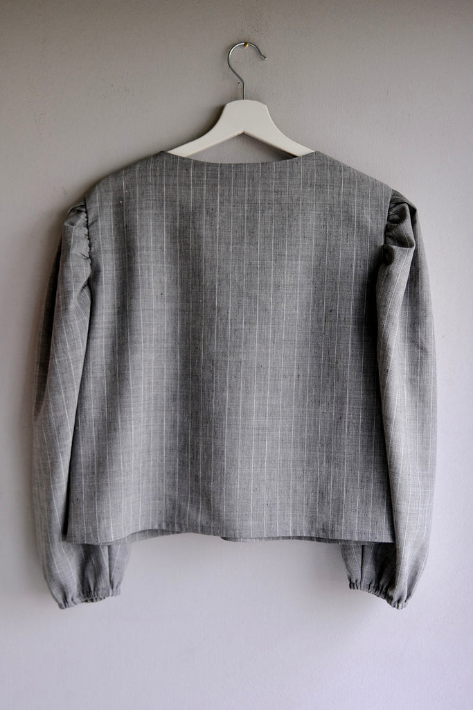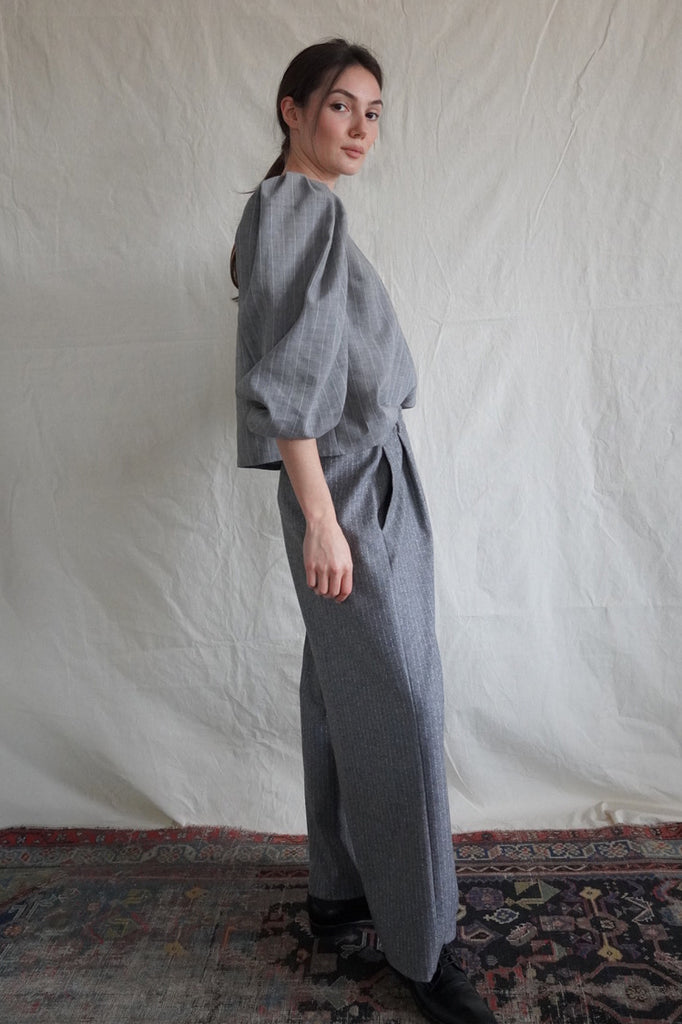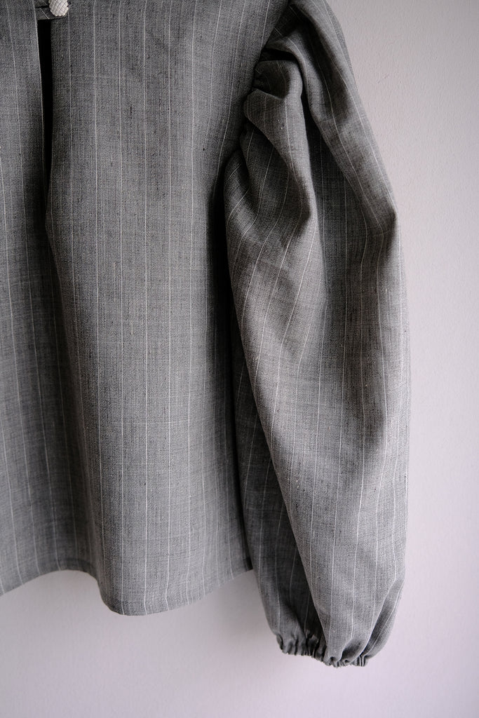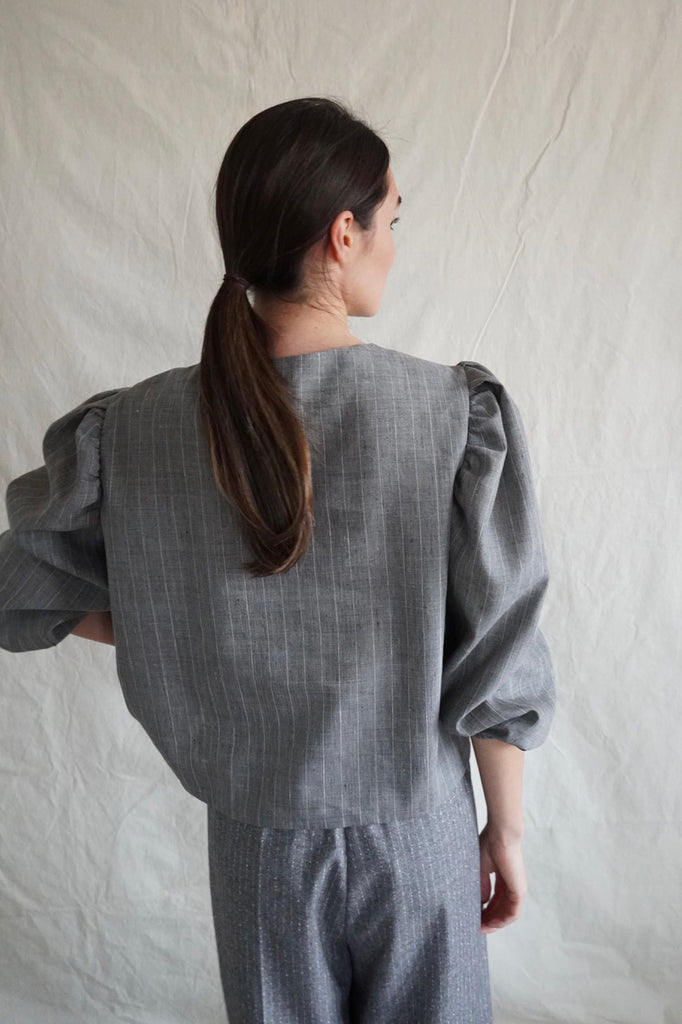 Elegantly tailored in a straight cut, this blouse features voluminous sleeves and a single front button closure for a refined, minimalist look. The linen-cotton blend with a fine white stripe is light and comfortable to wear, while the vintage white button adds a fresh, distinctive detail. Style it with our flannel Marseille or Palazzo trousers in grey stripes — sleeves pushed up for sculptural volume, or left down for an elongated silhouette.
