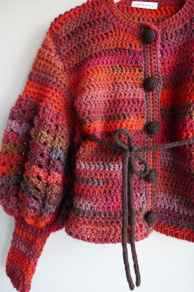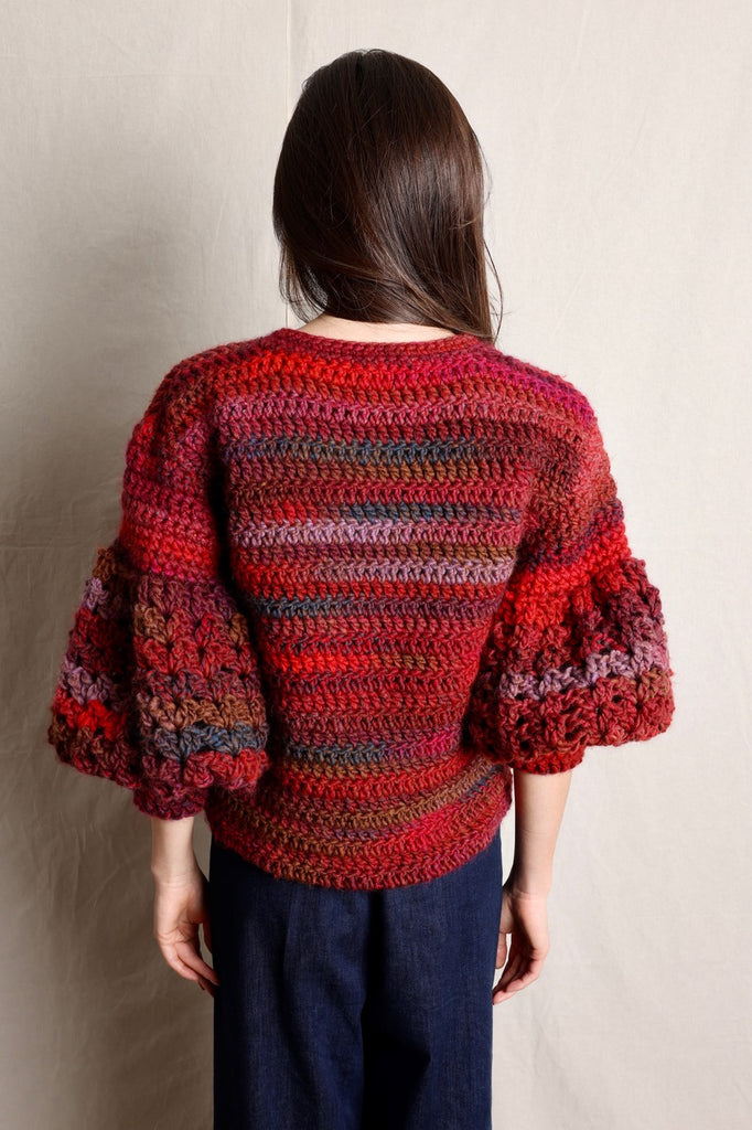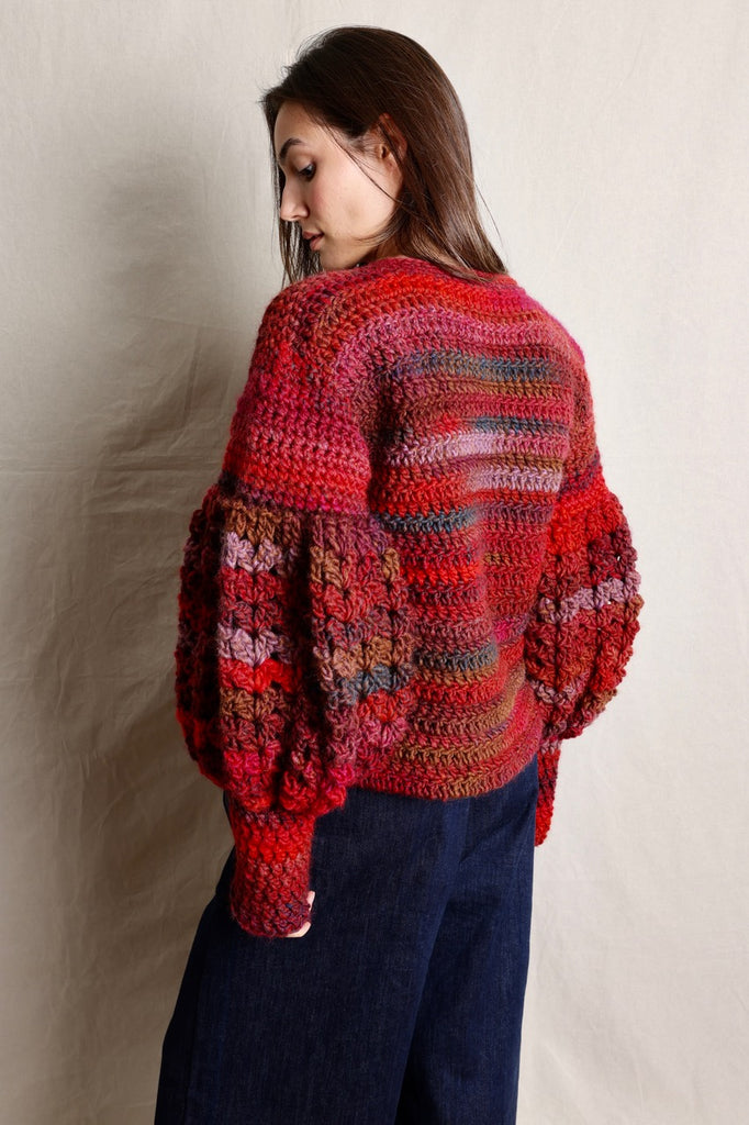 Crafted from a luxurious blend of 80% Merino wool and 20% organic Alpaca, this hand-crocheted cardigan showcases warm tones ranging from deep red and brown to rich aubergine. The design features voluminous trumpet sleeves that add a touch of couture elegance, complemented by five crochet-covered nugget buttons in chocolate brown.
