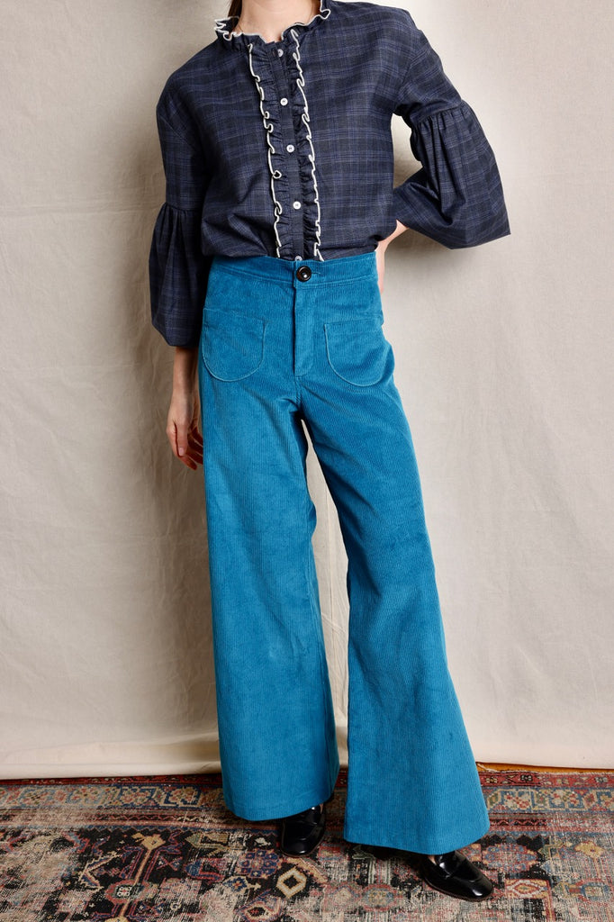 Our classic LIDO PANTS return this season in a soft Japanese cotton corduroy in vibrant blue. High-waisted with a straight cut, an elegantly flared extra-long leg, and two discreet side pockets, they bring a sleek silhouette inspired by classic men’s tuxedo tailoring.