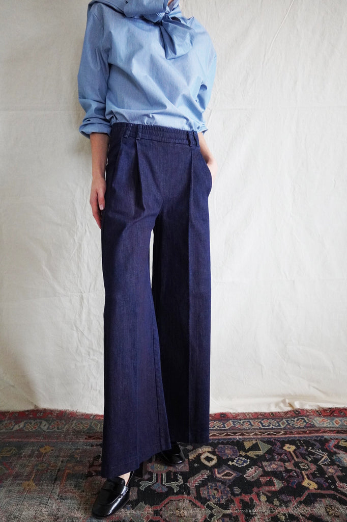 These flared Palazzo denim trousers can be worn high or low on the waist. The firm yet soft denim ensures a flattering and comfortable fit, complete with two side pockets and belt loops at the waist.