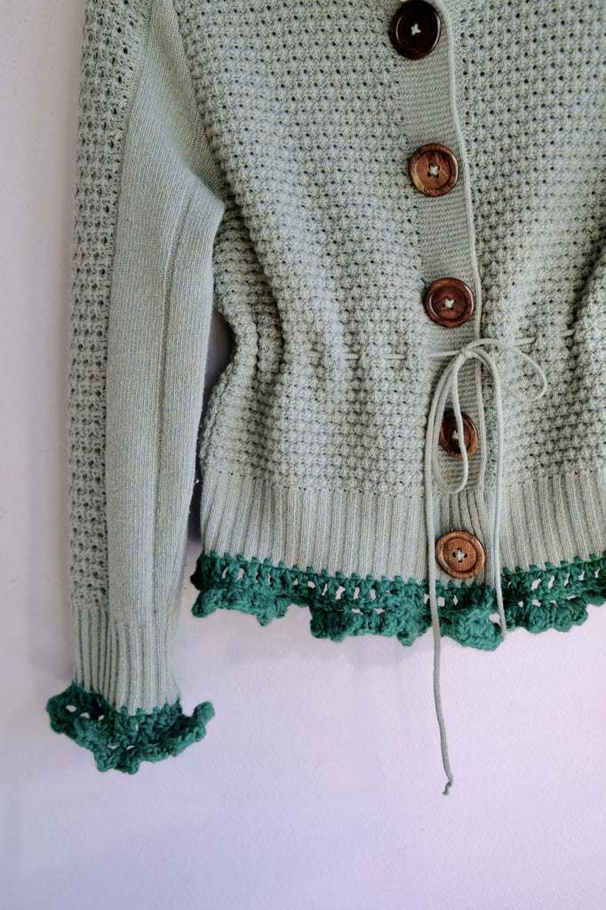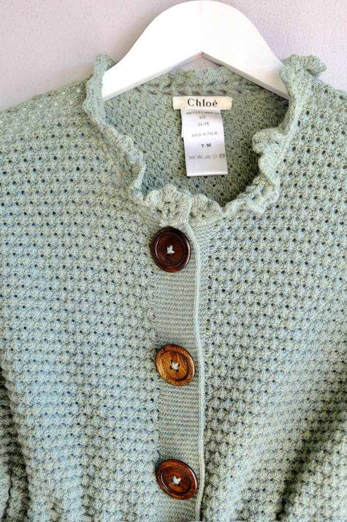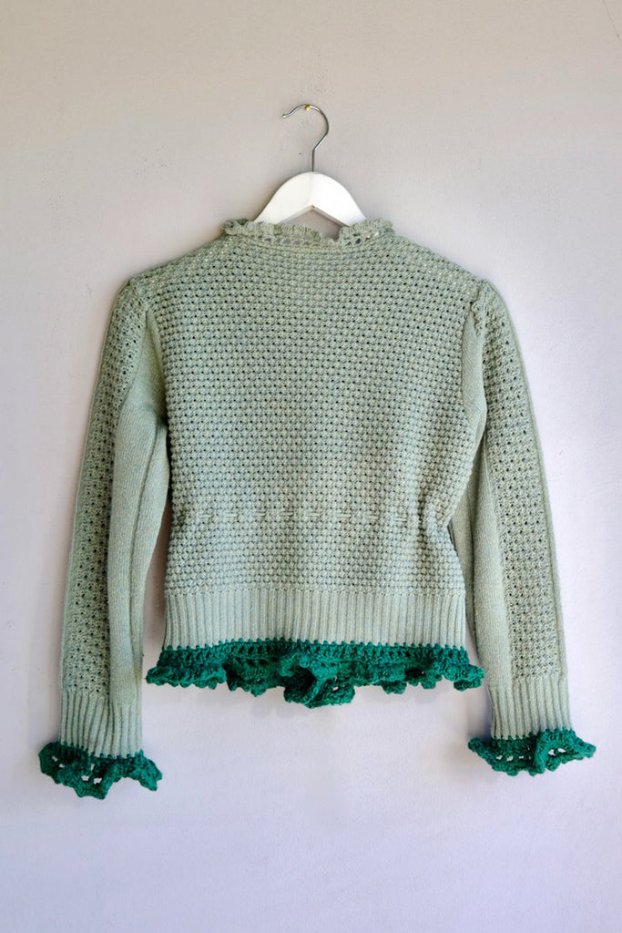 A vintage Chloé cardigan from 2006 in jade green, lovingly reworked in our Munich Atelier with a 100% deep-green cotton ruffled trim framing the sleeves and hem.